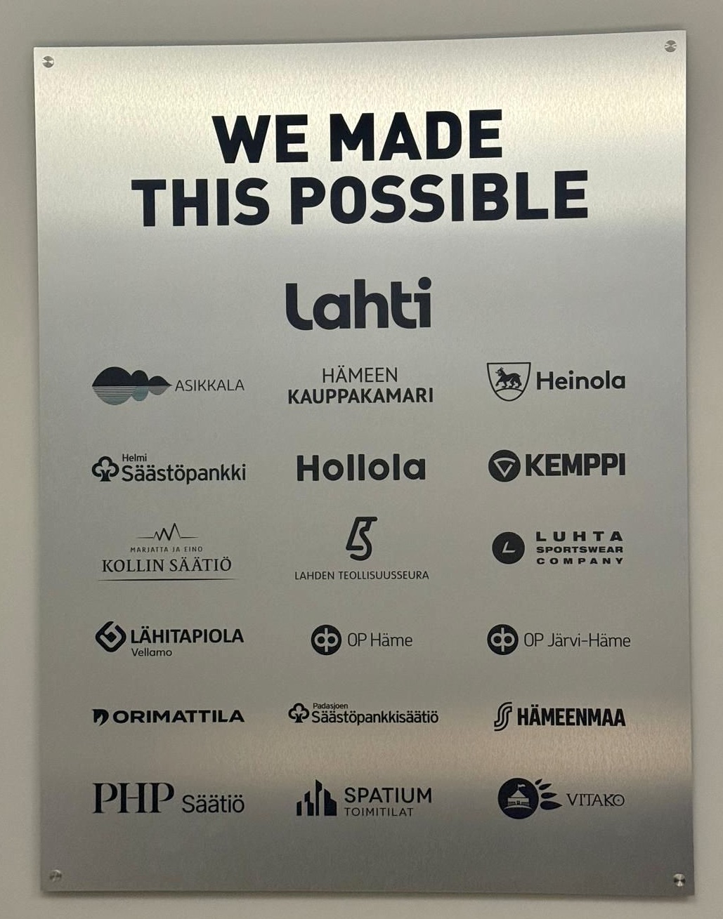 LUT-yliopiston rahoittajien joukkueeseen kuuluvat Spatiumin lisäksi Asikkalan kunta, Heinolan kaupunki, Helmi Säästöpankki ja Padasjoen Säästöpankkisäätiö, Hollolan kunta, Hämeen kauppakamari, Kemppi Group Oy, Lahden kaupunki, Lahden teollisuusseura, Luhta Sportswear Company, Lähi-Tapiola Wellamo, Marjatta ja Eino Kollin säätiö, Orimattilan kaupunki, Osuuskauppa Hämeenmaa, OP Häme, OP Järvi-Häme, PHP säätiö ja Viipurin taloudellinen korkeakouluseura ry. Rahoitussumma vaihtelee 50 000–250 000 euron välillä.